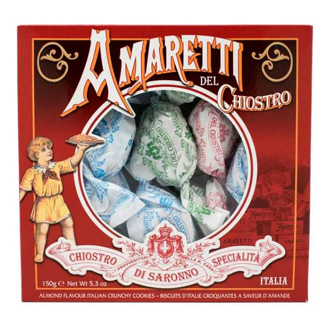Amaretti lages indutrielt og for hånd, i uanseelige former eller med stil, og med kjedelig til spektakulær smak. Dette er festutgaven av amaretti! Disse er laget i Saronno, nært Milano og klostret Saronno (Chiostro di Sarenno). Og de er laget av en bedrift som er spesialisert på nettopp amaretti, samt likøren Amaretto (basert på samme småkake).