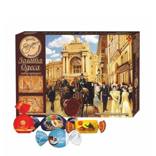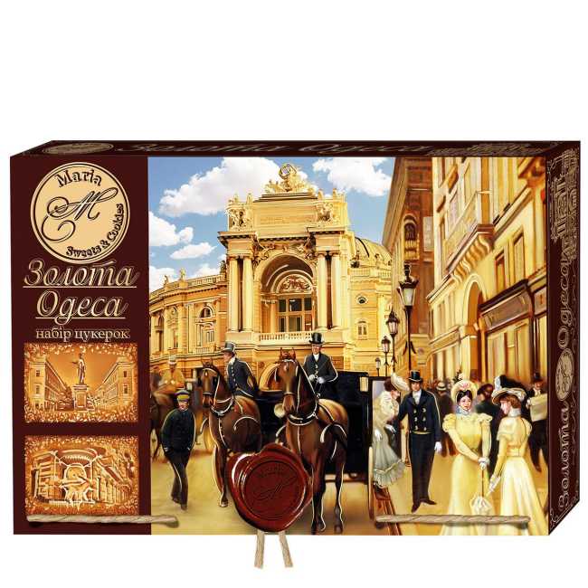 Denne originale, ukrainske konfekten kommer i en overveldende, godt forseglet eske, med forgylte motiver fra den vakre byen Odesa (tidl. Odessa) ved Svartehavet. En nydelig presang, eller en godteeske man ikke vil dele med noen!
