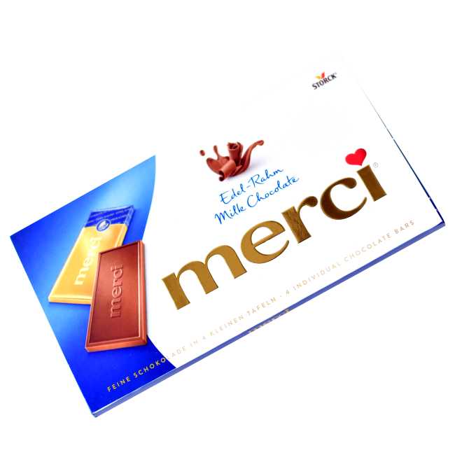 Merci er et av de mest populære sjokolademerkene på kontinentet, og selges verden rundt. Merci har vært produsert i Tyskland siden 1962 (og senere også ellers i verden), og blitt kjent som en kvalitetsvare med mye gode smaker og godt tenkt design. Sjokoladeplatene fra Merci består av en pakke på 4 separat innpakkede småplater, slik at du enkelt kan både porsjonere og dele nytelsen!