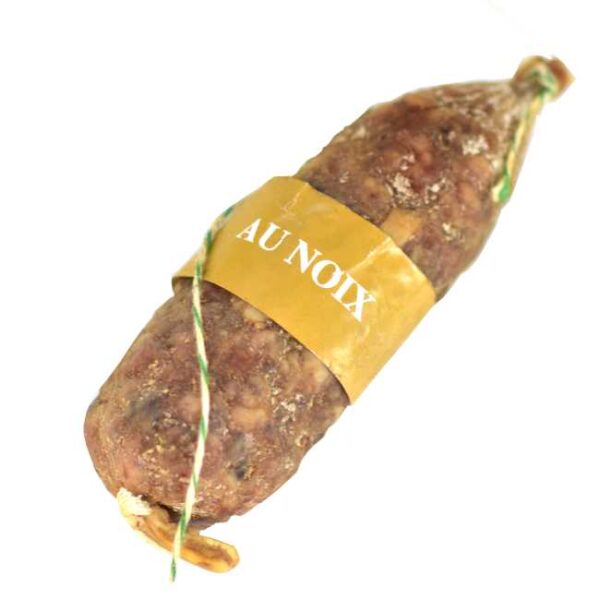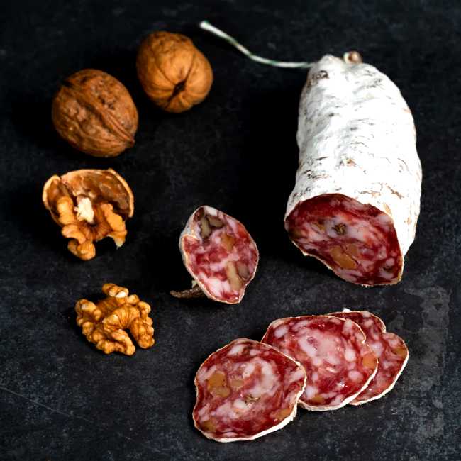 Dette er en skikkelig fransk håndverksspekepølse fra fjellene i Ardèche i Sørøst-Frankrike! Den heter saucisson sec aux Noix på fransk, noe vi kan oversette til «spekepølse med valnøtter». Det er snakk om en håndlaget spekepølse i svært fransk tradisjon, med en fuet-lignende grunnsmak og en behagelig konsistens som verken er for hard eller for myk. Denne er i tillegg smakssatt med en god porsjon valnøtt fra Périgord (AOP), slik det er tradisjon for i Sør-Frankrike.